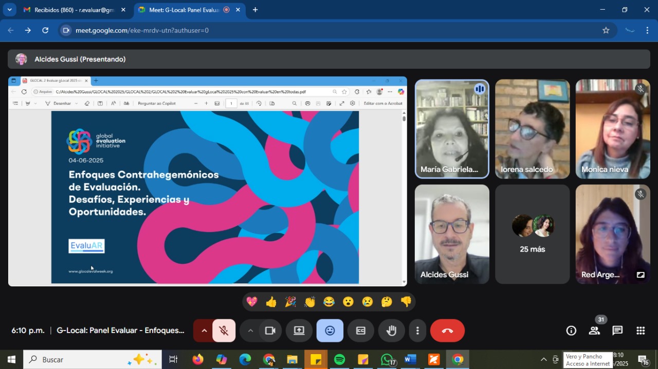 La Semana de la Evaluación gLOCAL (gLOCAL Evaluation Week) es un evento global anual organizado por la Global Evaluation Initiative (GEI) y los Centros CLEAR, que reúne a profesionales, académicos, representantes gubernamentales y de la sociedad civil de todo el mundo para compartir conocimientos, experiencias y herramientas en torno al monitoreo y la evaluación de políticas públicas. Este año, entre el 2 y el 6 de junio de 2025, y bajo el lema “Evaluación para un Futuro Mejor: Sostenibilidad Ambiental, Inclusión y Paz”, el evento se consolidó como un espacio estratégico para activar redes de colaboración, fortalecer capacidades institucionales y promover el uso de evidencia en la toma de decisiones. La Asociación Civil EvaluAR participó activamente en la agenda regional impulsando dos paneles integrados por socios y socias, junto a especialistas invitados de distintos países de América Latina. El 5 de junio se llevó a cabo el panel “Enfoques contrahegemónicos de evaluación: desafíos, experiencias y oportunidades”, con la participación de referentes de Argentina, Brasil y Ecuador. Coordinado por María Gabriela Molina, el panel propuso repensar la evaluación desde una perspectiva situada, crítica y decolonial, cuestionando los marcos tradicionales y visibilizando las asimetrías de poder históricas en el campo evaluativo. Se destacó la necesidad de promover evaluaciones interculturales que respeten los saberes locales, las cosmovisiones indígenas y las prácticas comunitarias, incorporando además enfoques interseccionales que consideren las múltiples dimensiones de la desigualdad. Participaron Alcides Gussi, Lorena Salcedo, Celeste Ghiano, Magdalena Frigerio, Paula Magariños, Mónica Nieva, Verónica Crescini y Germán Beber. Durante el intercambio se identificaron desafíos clave, como la superación de modelos estandarizados, la inclusión efectiva de comunidades históricamente excluidas y el reconocimiento del carácter ético-político de toda evaluación. Asimismo, se subrayaron oportunidades en torno a la construcción colectiva de evaluaciones situadas, el desarrollo de herramientas metodológicas adaptadas a contextos diversos, y la formación de evaluadores con enfoques transformadores. También se valoraron los aportes de la cooperación Sur-Sur, impulsada por redes como ReLAC, EvalIndigenous y distintas VOPES, que promueven prácticas colaborativas, participativas e innovadoras. El panel concluyó con un llamado a seguir construyendo evaluaciones comprometidas con un “nuevo ahora de la humanidad”, más inclusivo, justo y plural. El 6 de junio se desarrolló el panel “Evaluación en Argentina: perspectivas actuales y futuras”, con la moderación de Eva Arias y la participación de Natalia Aquilino, Vanesa Castro, Sabrina Cecilia Serer, Marcela Rebón, Amanda Valenzuela y Verónica Crescini. La conversación giró en torno a los principales interrogantes que atraviesan el campo evaluativo en el país: ¿qué se evalúa hoy?, ¿quiénes lo hacen?, ¿con qué enfoques y prioridades? En un contexto de transformación del rol del Estado, el debate expuso un panorama desafiante, atravesado por el desfinanciamiento, la retracción de prácticas institucionalizadas y una creciente desconfianza en la evidencia. No obstante, se identificaron señales esperanzadoras, como el protagonismo de nuevas generaciones de evaluadores, la consolidación de iniciativas locales y el rol estratégico de las universidades, aún con recursos limitados. Se remarcó la importancia de fortalecer la cultura evaluativa mediante alianzas interinstitucionales, la generación de políticas públicas que aseguren recursos sostenibles y la promoción de campañas de sensibilización sobre el valor de la evaluación. En un escenario marcado por la desinformación, la evaluación continúa siendo una herramienta esencial para promover decisiones públicas informadas, eficaces y sostenibles.